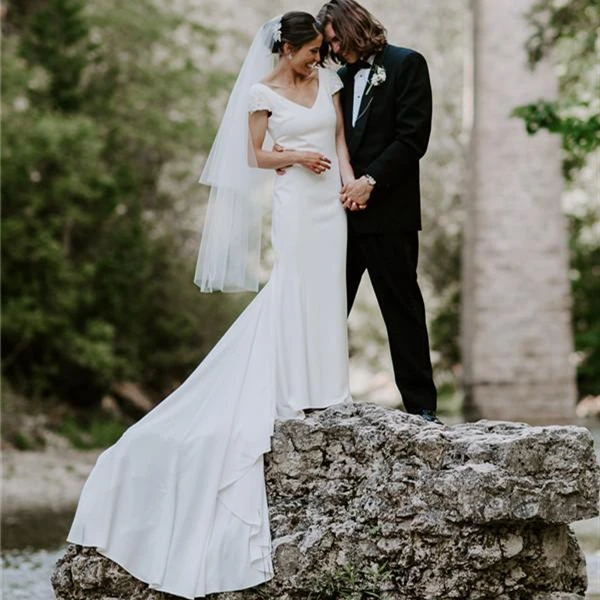 V-neck Long Mermaid Simple Ivory Wedding Dresses