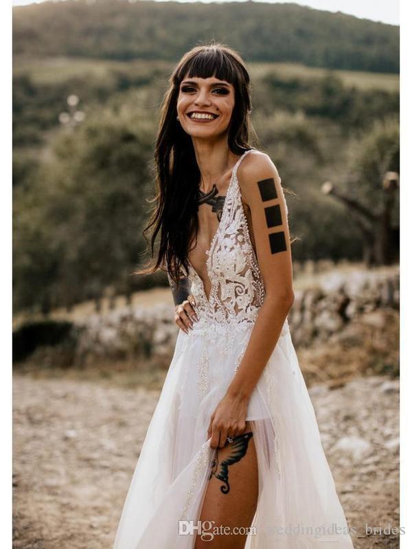 Rustic lace Bohemian Country Wedding Dress Sexy Plugging Neckline Thigh Split Illusion Boho Bridal Gowns