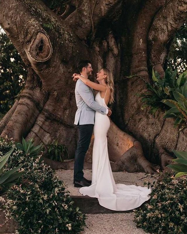 Simple Mermaid V Neck White Soft Satin Wedding Dress