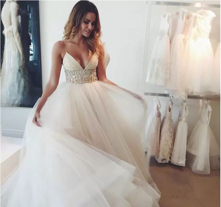 Romantic Spaghetti Strap Beaded Waist Wedding Dress A-Line Long Women Bridal Party Gown