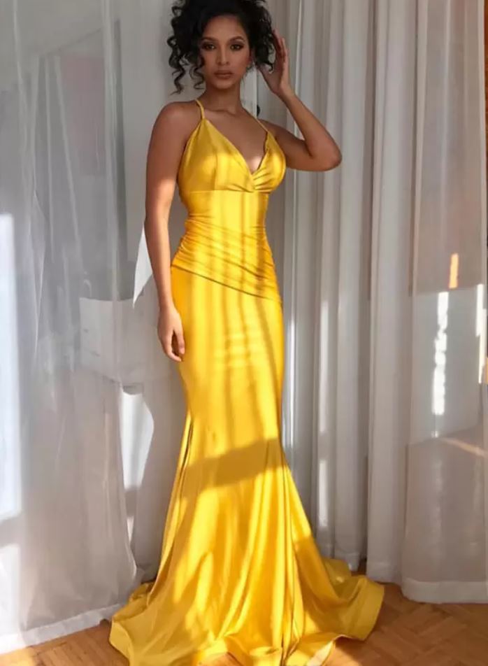 Simple Yellow Mermaid Prom Dresses V Neck Spaghetti Strap Ruffles Party Gowns Floor Length Custom Made Evening Dresses