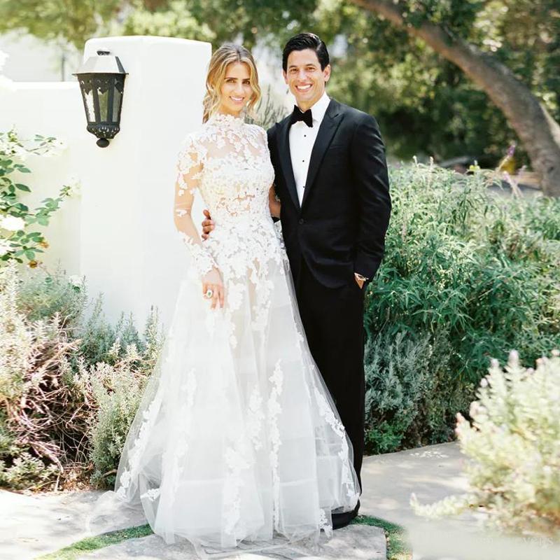 Chic High Neck Long Sleeve A Line Wedding Dresses Lace Appliques Zipper Back Floor Length Bridal Gowns