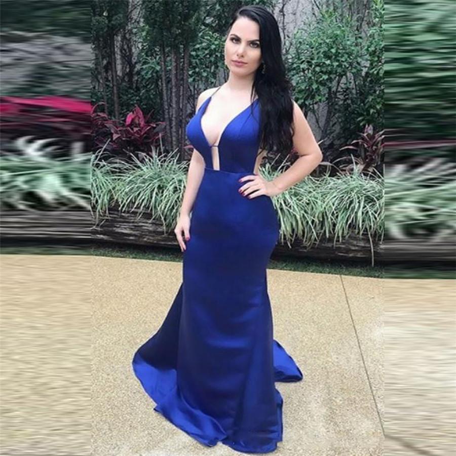 Sexy Spaghetti Strips Mermaid Prom Dresses Criss Cross Back Royal Blue Formal Natural Slim Women Special Occasion Party Gowns