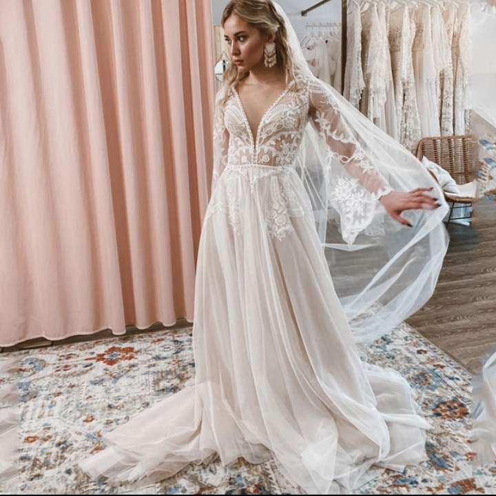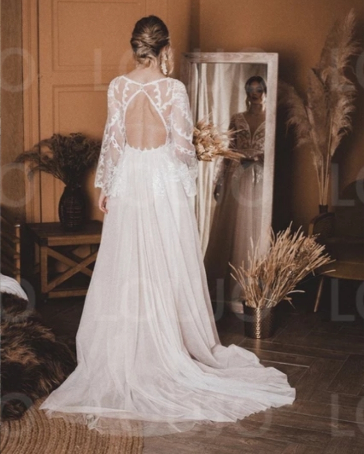 Long Sleeve A-Line Wedding Dress Open Back V-Neck Bohemian Lace Applique Bridal Gowns