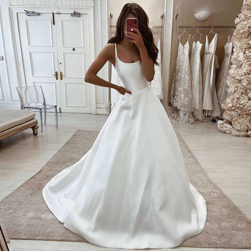 Satin White Wedding Dresses for Women Simple Spaghetti Straps Wedding Gown Ivory A-Line Backless Bride Dress