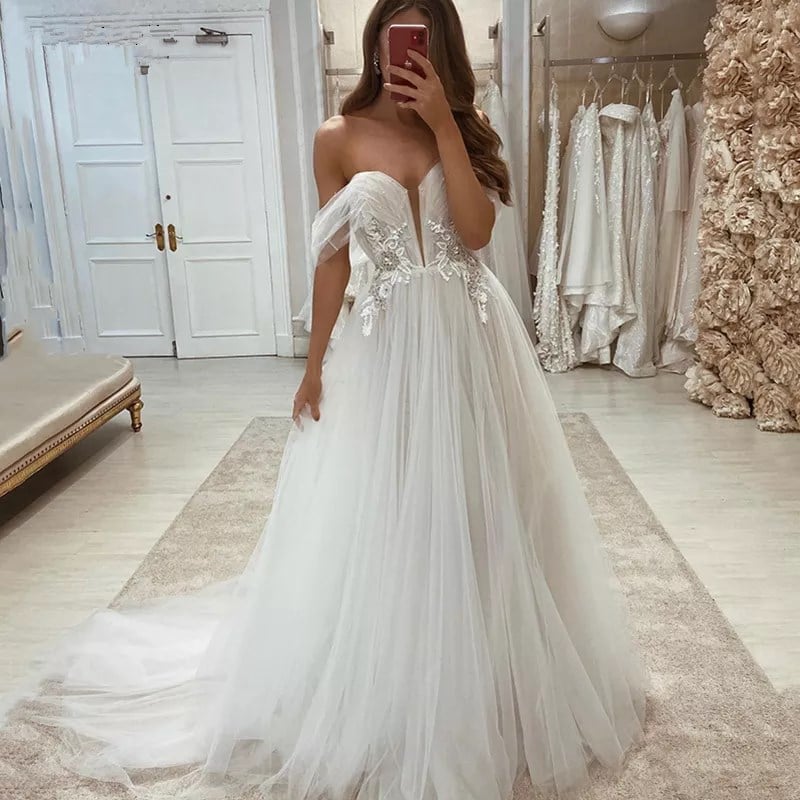 Sexy Deep V-Neck Off Shoulder Wedding Dresses Short Sleeves A-Line Beach Bridal Gowns Elegant Lace Applique Tulle Bride Dress