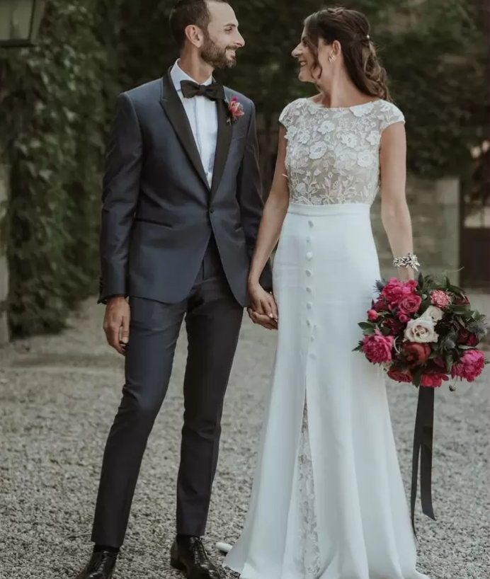Enchanting Cap Sleeve See Through Lace Chiffon Fitted Wedding Dresses Sheath Open Back Boho Wedding Dress Sweep Train Rustic Bridal Dress