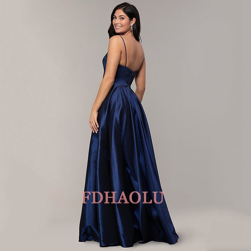 Navy Blue Long Prom Dresses Sexy V Neck Green Satin Evening Party Gown