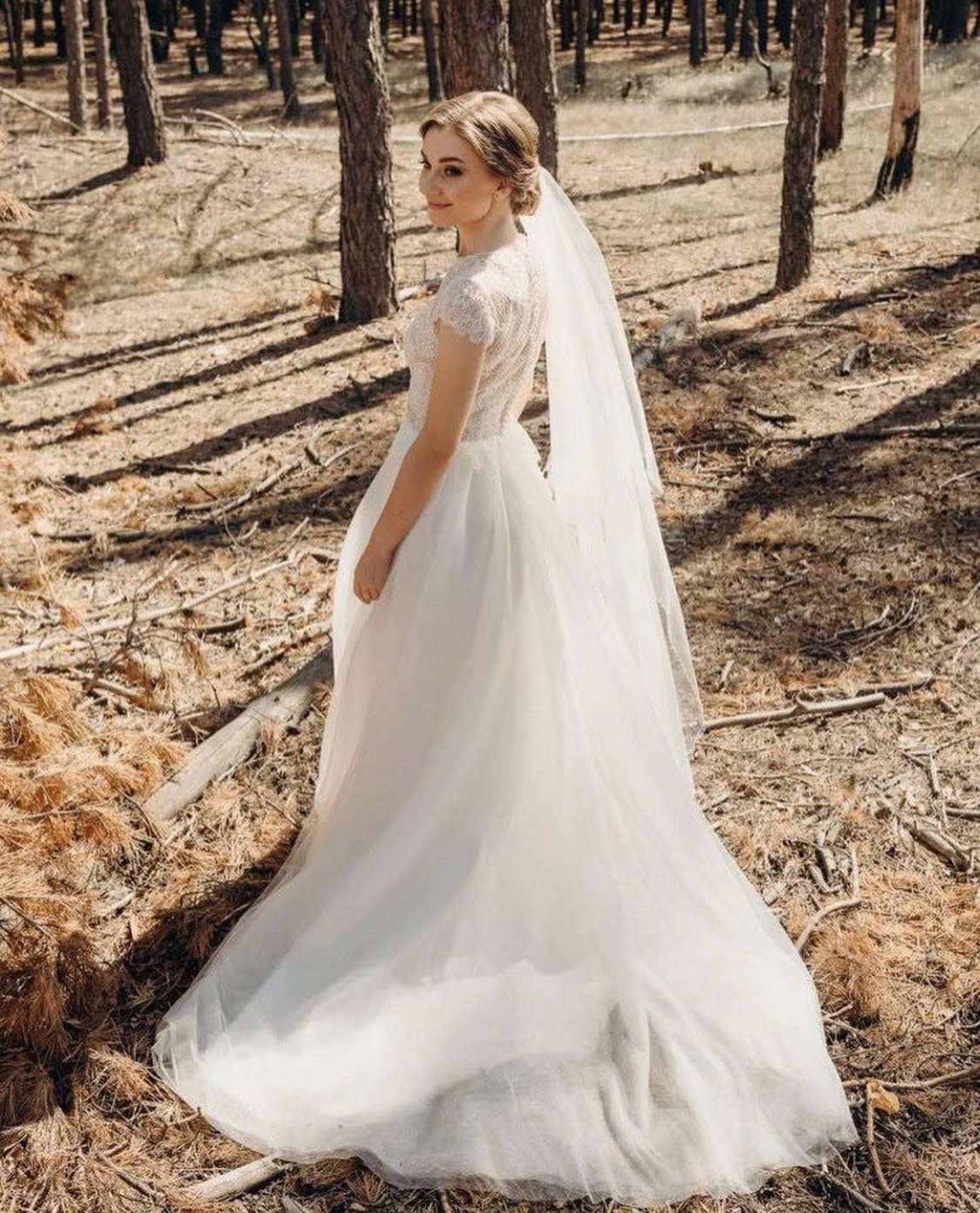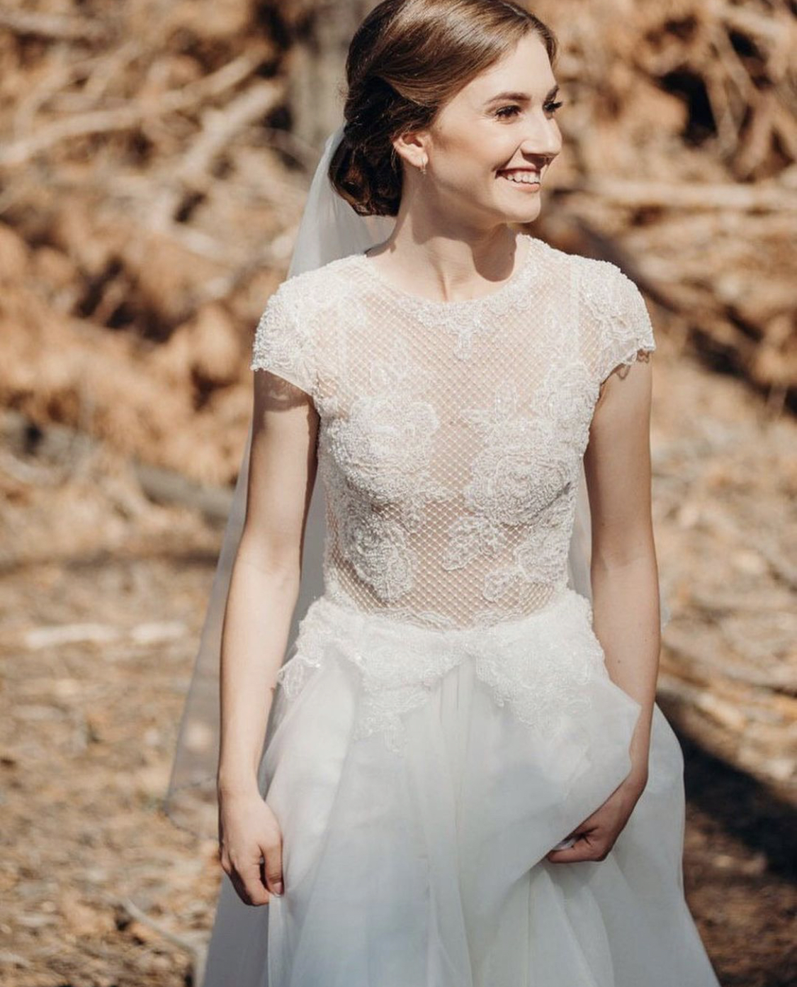 Lace Appliques Wedding Dress A-Line O-Neck Cap Sleeve Sequined Pearls Button Back Floor Length Sweep Train Elegant Bride Gown