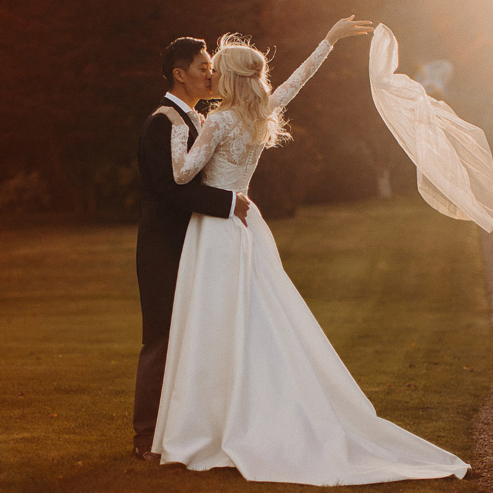 A Line Satin Muslim High Neck Wedding Dress Long Sleeves Cathedral Modern Buttons Bridal Gown