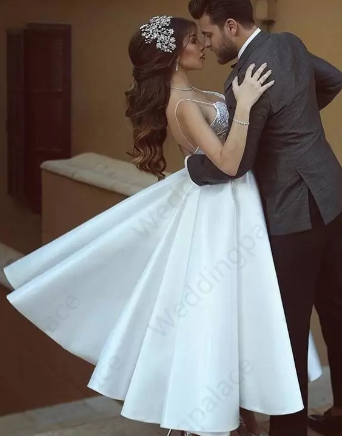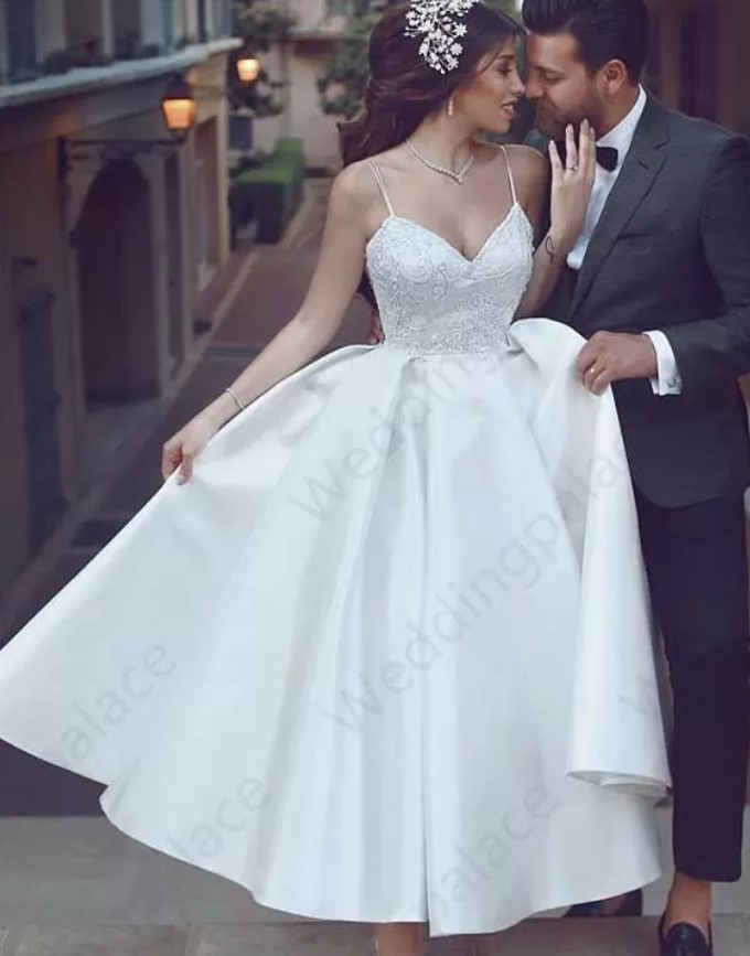 Sexy Spaghetti Backless Simple Lace Stain Summer Holiday Seaside Bridal Short Wedding Gown