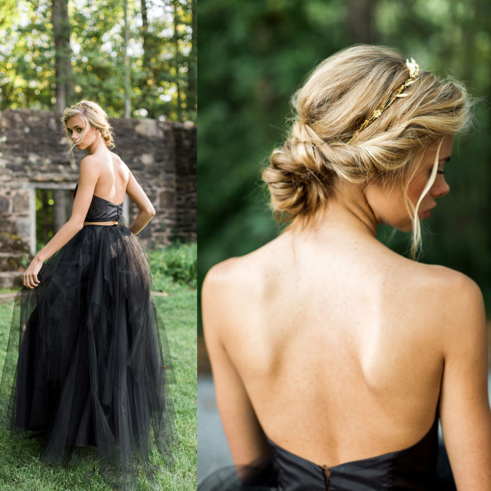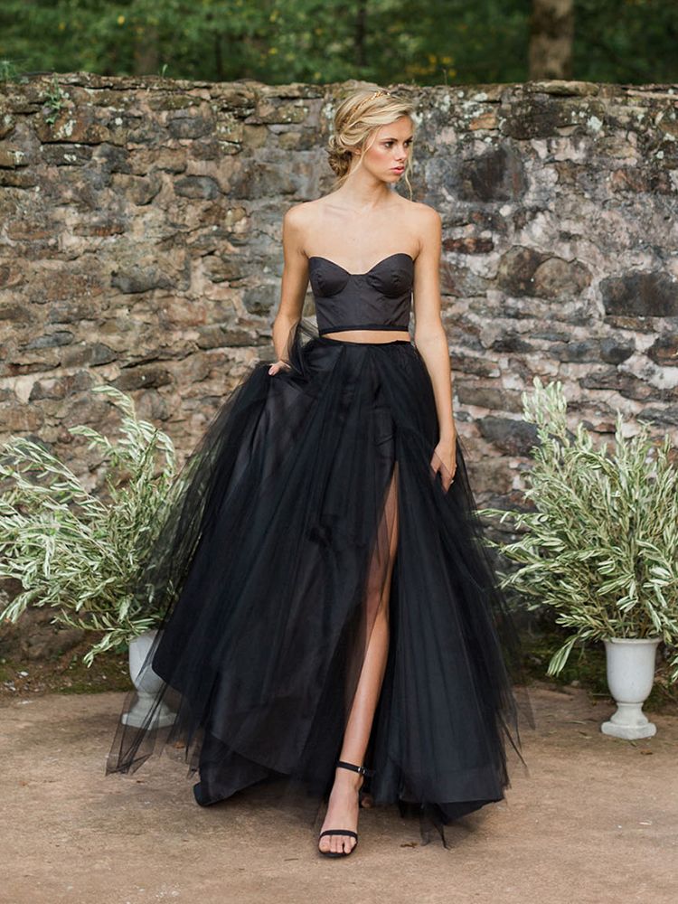 Simple Two Pieces Crop Top Strapless Sleeveless Black A-Line Wedding Dress