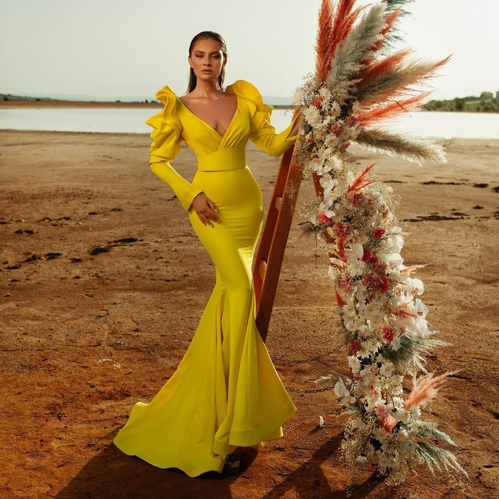 Elegant Satin Mermaid Prom Dress Long Puffy Sleeves Deep V-Neck Evening Dress Sexy Party Dress