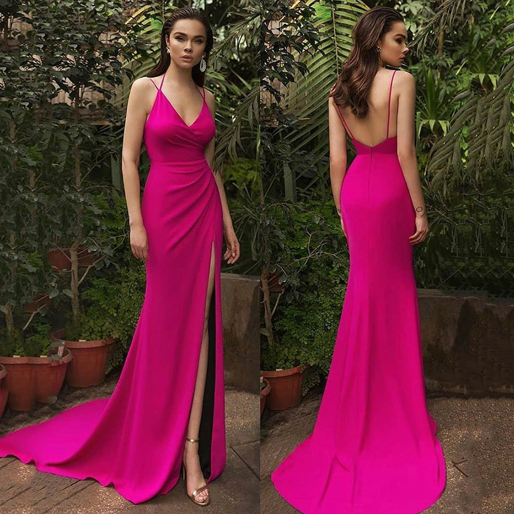 Chic Mermaid Fuchsia Long Prom Dress Sexy Spaghetti Straps Backless Evening Dress