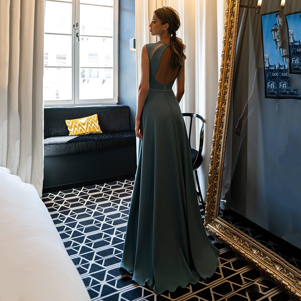 Elegant Evening Dress A-Line O-Neck Open Back Sleeveless Beading Satin Prom Gowns