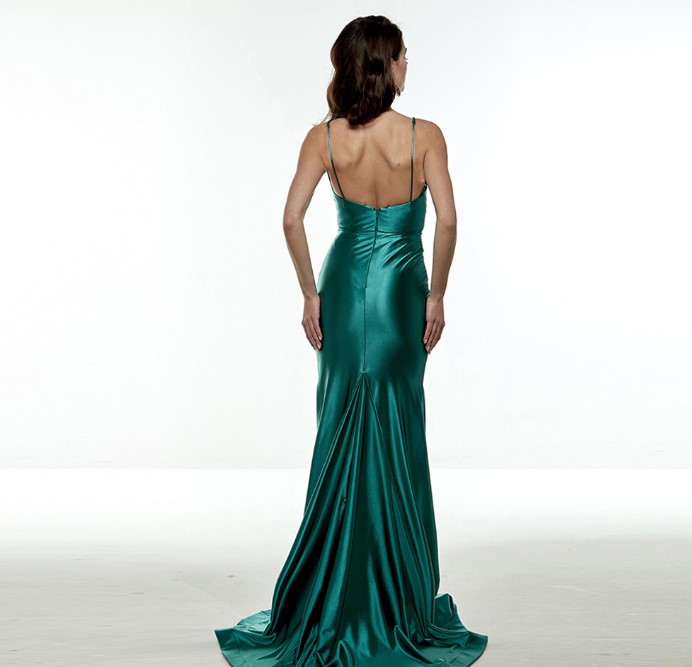 Emerald Green Spaghetti Strap V Neck Bow Padded Satin Prom Gown