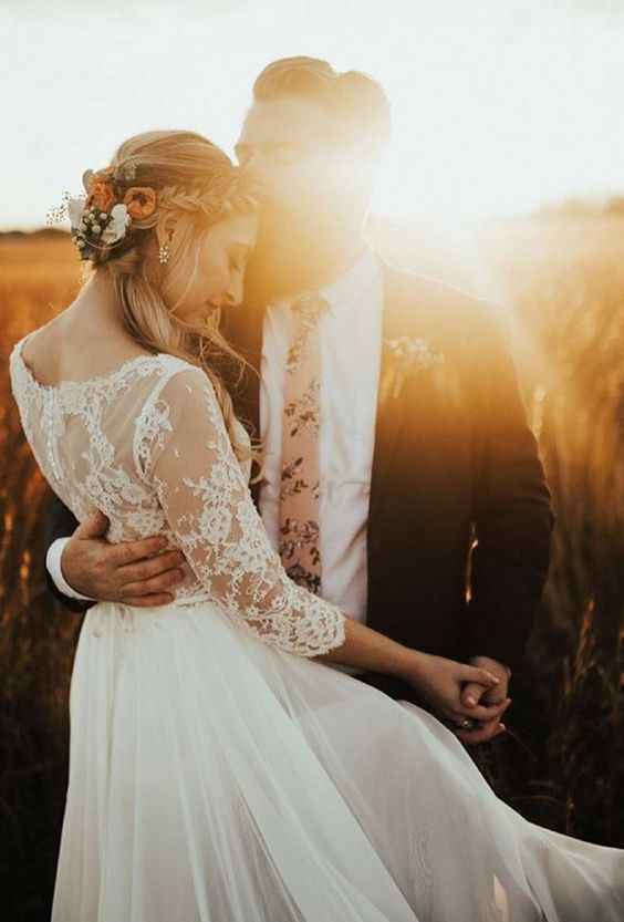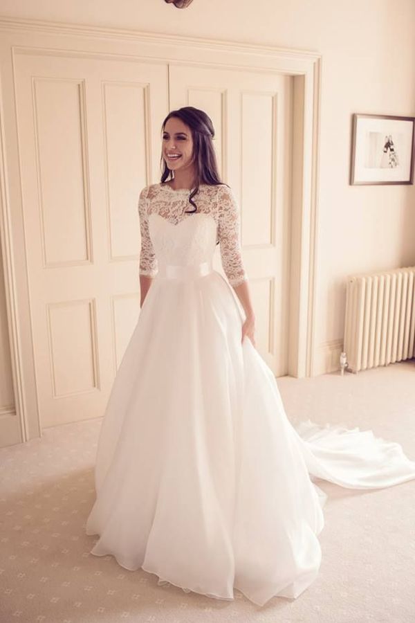 Elegant 3/4 Sleeves Round Neck Lace Wedding Dress