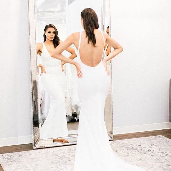 Mermaid V Neck Backless White Satin Wedding Dress