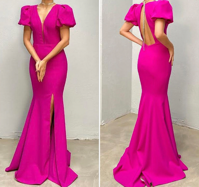 Pink V Neck Lantern Sleeve Split Leg Side Sexy Backless Fiesta Prom Dress