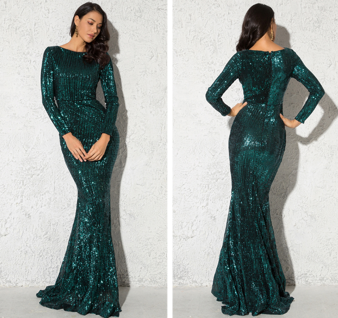 Modest Green Long Sleeve Mermaid Sequin Evening Gown
