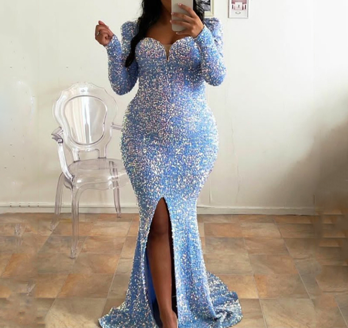 Sky Blue Long Sleeve Mermaid Wedding Gown Shiny Sequin Stretchy Velvet Slit Leg Evening Dress