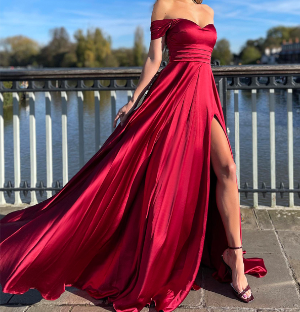 Off the Shoulder A Line Burgundy Sexy Backless Padded Slit Leg Evening Dress