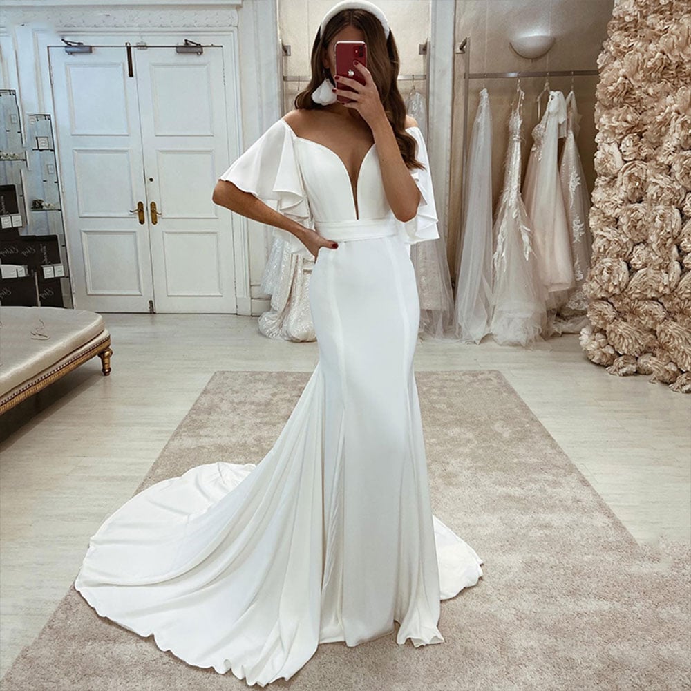 Elegant Flare Sleeves Open Back BOHO Deep V-Neck Beach Sweep Train Soft Satin Mermaid Wedding Dress