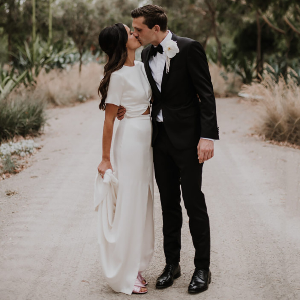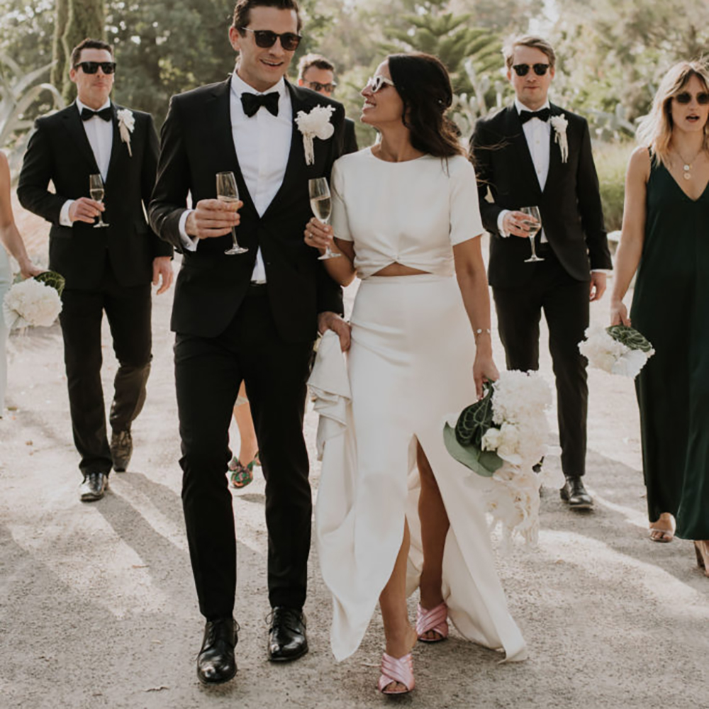 Sheath Ruched Crepe Crop Top Wedding Dress Simple Custom Made Satin Brush Train High Split Short Sleeves Minimal Bridal Gowns