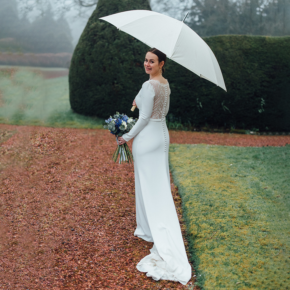 Sheath Satin Lace Back Wedding Dress Custom Made Plus Size Long Fitted Sleeves Button Closure Round Neck Bridal Gowns