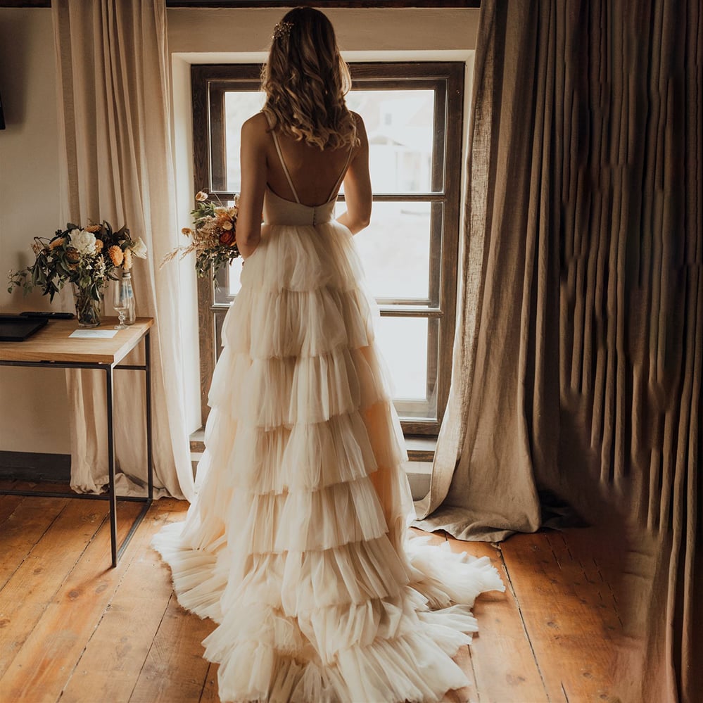 Layered Tulle Spaghetti Straps Open Back Wedding Dress A Line Big Size V Neck Nude Brush Train Elegant Custom Made Bridal Gowns