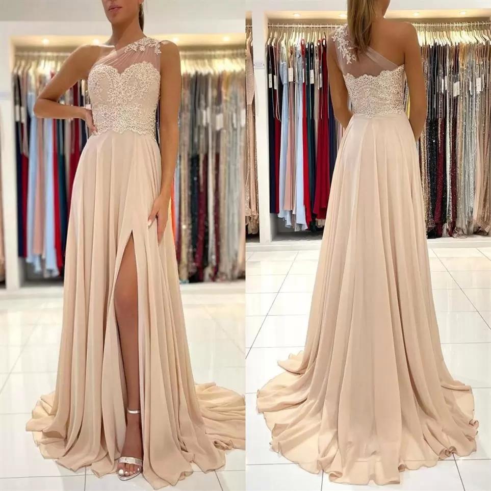 Champagne Prom Dresses One Shoulder A Line Floor Length Side Slit Lace Chiffon Evening Formal Wear Cocktail Party Gowns