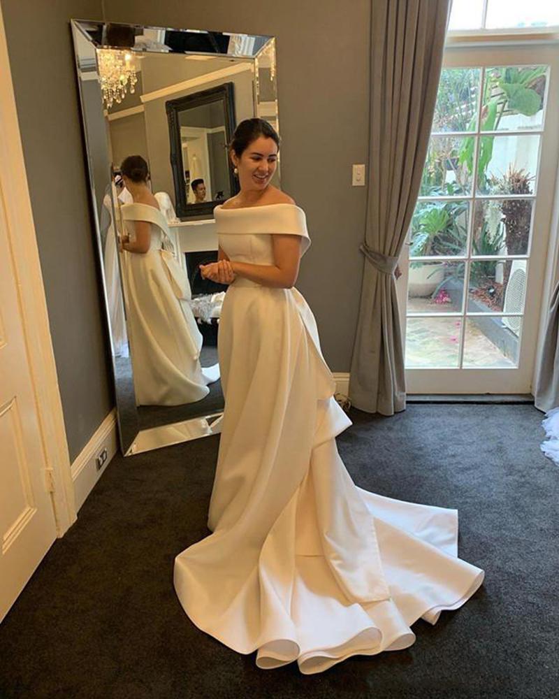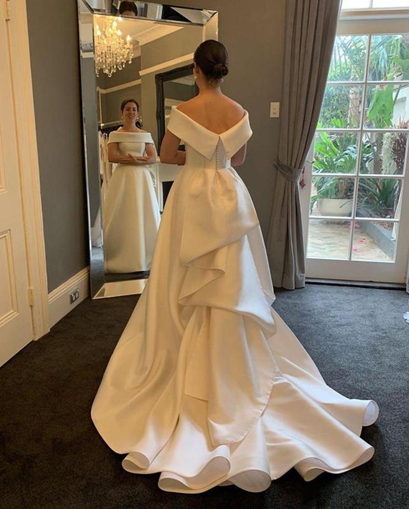 Vintage Satin A Line Wedding Dresses Covered Button Back Long Sweep Train Ruffles Bateau Bride Gowns