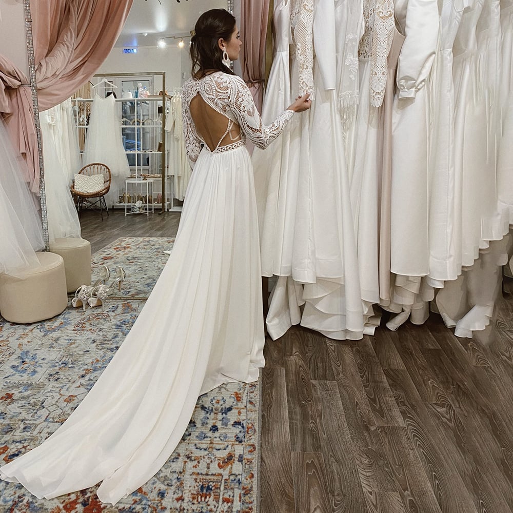 See Through Lace Chiffon High Split Wedding Dress with Train Custom Made Long Sleeves Hollow Back Round Neck Bridal Gowns
