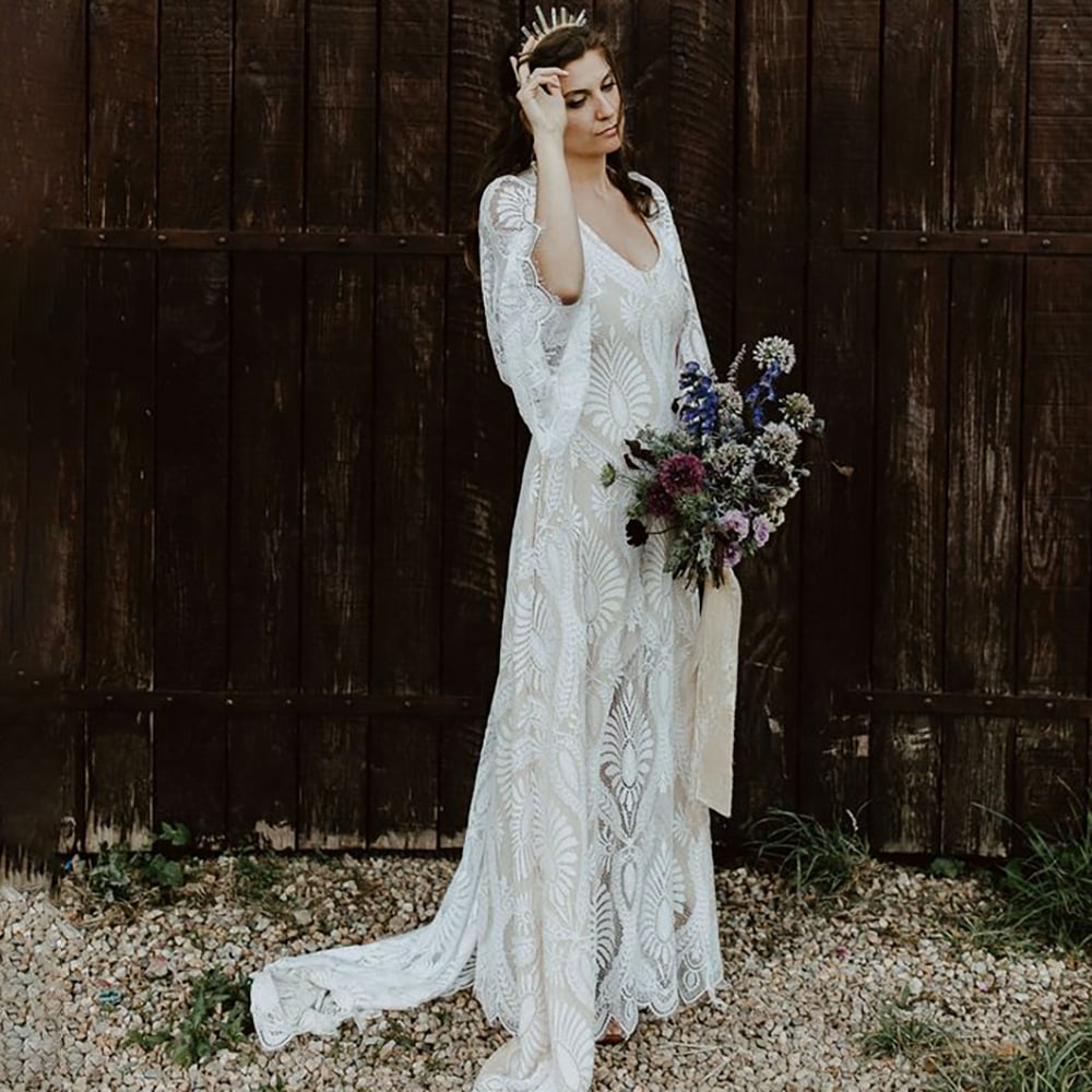 Overweight Bohemian Lace Scoop Long Flare Batwing Sleeves Wedding Dress Custom Made Boho A Line Closed Back Buttons Bridal Gown