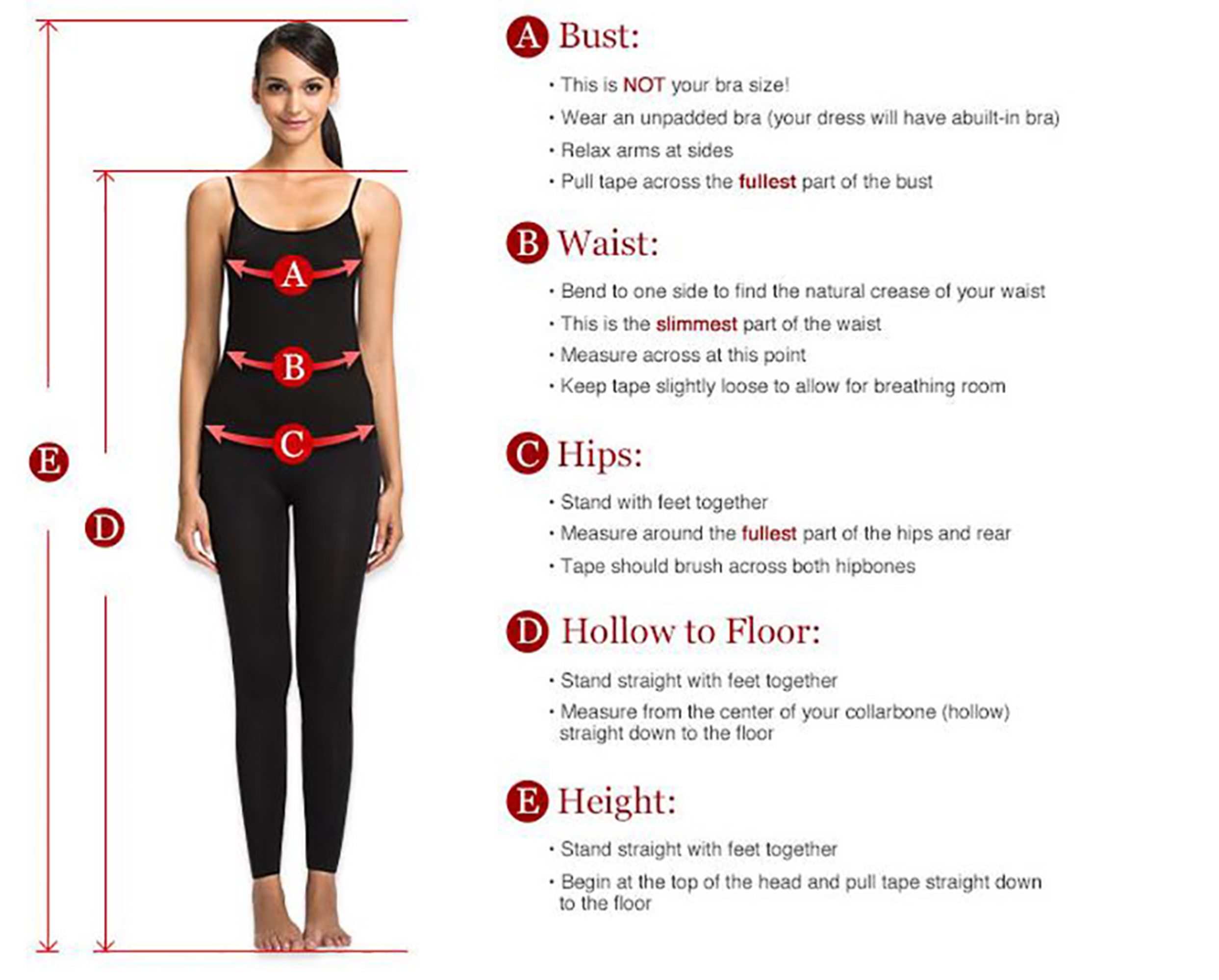If you need a custom made dress, please measure youself according to the picture guider and send us the following important measurements: