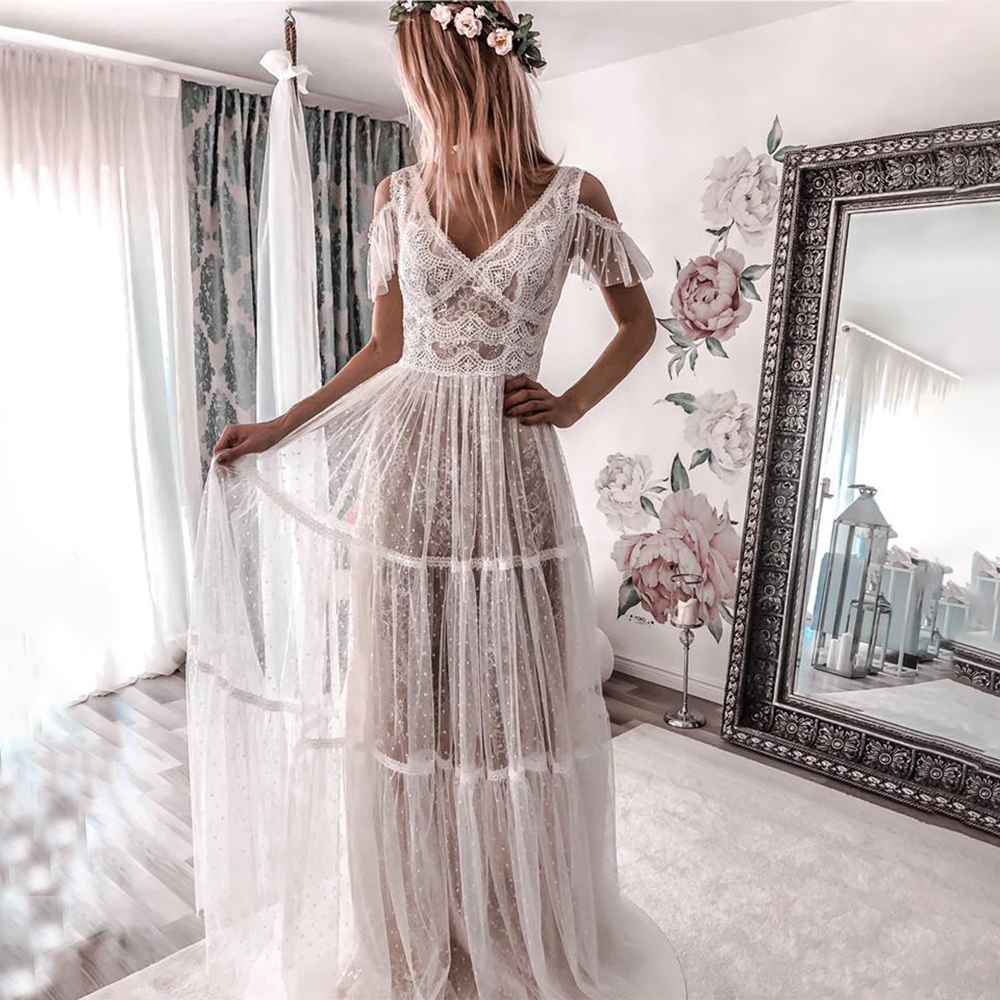 Bohemian Dotted Tulle CrissCross Beach Bridal Gown Custom Made Spaghetti Straps Backless Boho Lace Destination Wedding Dress