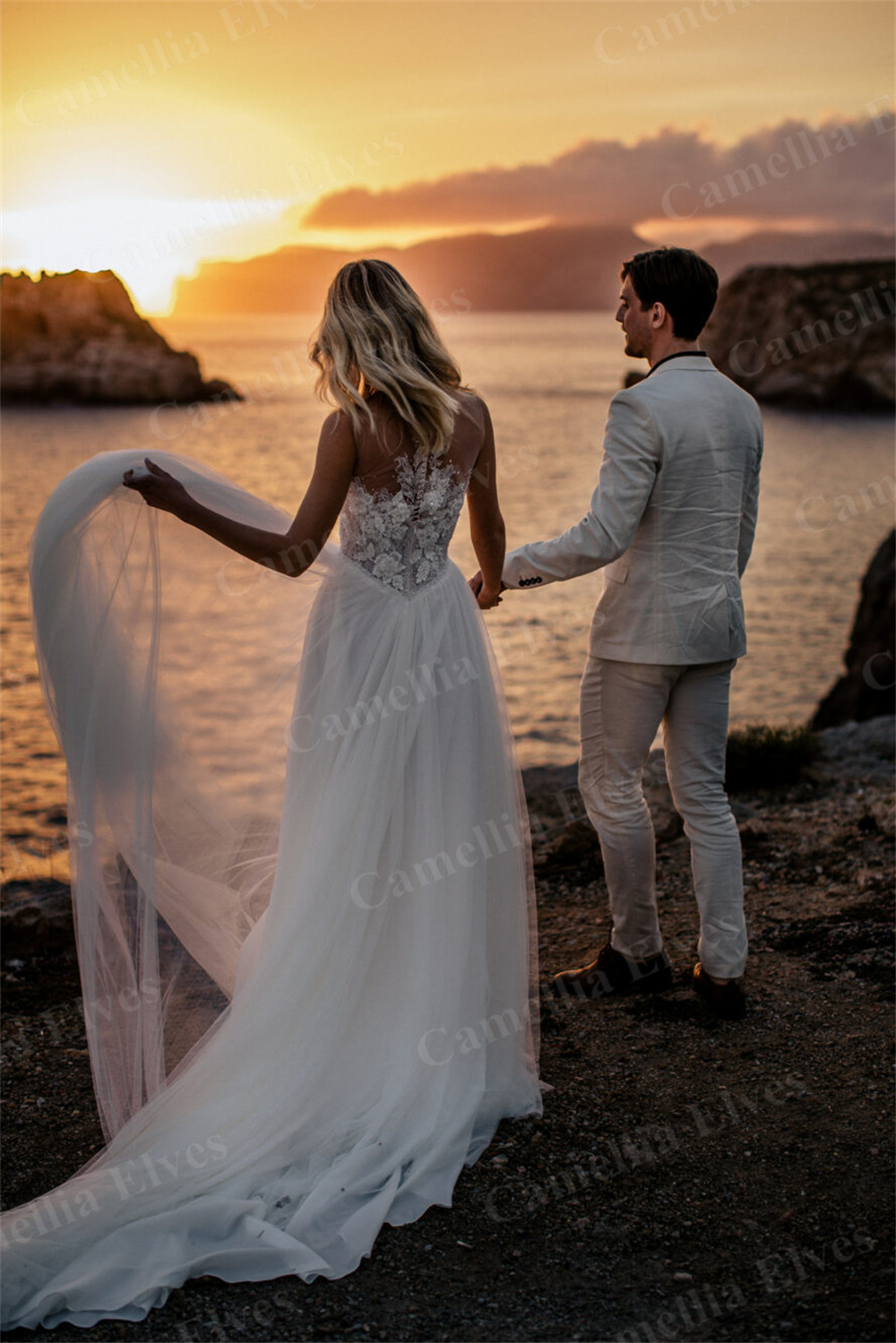 Beach Wedding Gowns Boho Tulle Lace Wedding Dresses Vestido De Noiva 3D Flowers Bridal Gowns