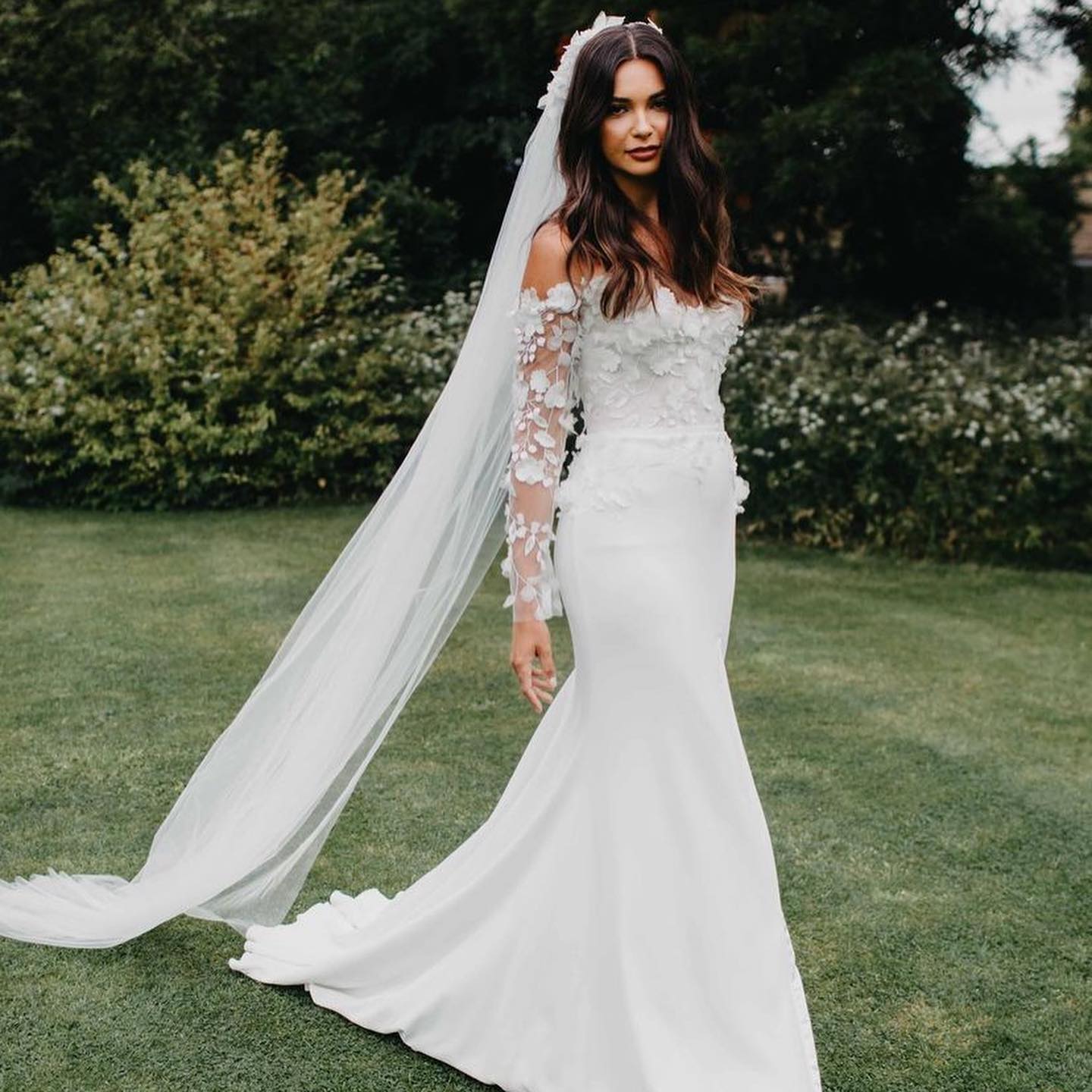 Sweetheart Long Sleeves 3D Flowers Wedding Dress Custom Made High Split Sweetheart Off Shoulder Bursh Train Modern Bridal Gowns
