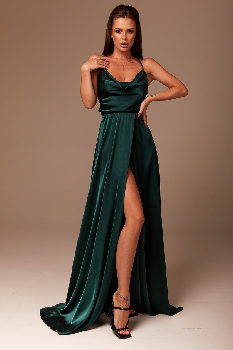 Dark Emerald Green Silk Maxi Flared Dress with Slit