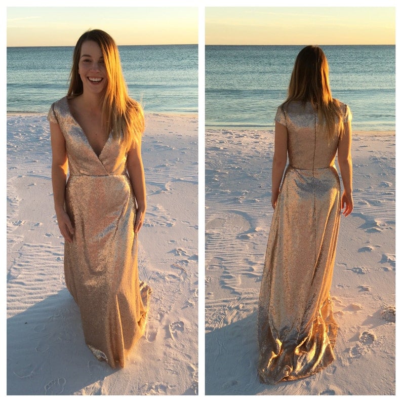 Sexy V-Neck Cap Sleeves Rose Gold Sequin Long Prom Dress with Long Train