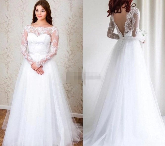 Simple Wedding Dresses Long Sleeves Illusion Bateau Neckline Scalloped Tulle Sweep Train Wedding Gowns