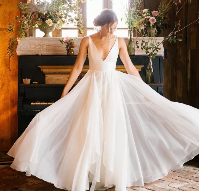 Simple White Chiffon Beach Wedding Dresses A Line V Neck Floor Length Backless Long Bridal Dress
