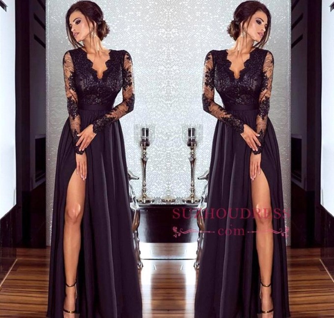 Sexy Black V Neck Sheer Long Sleeves Evening Dresses Lace Top Split A Line Party Prom Dresses