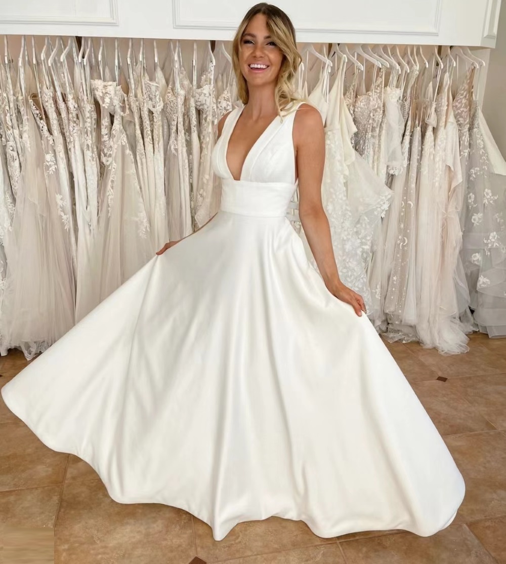 A-Line Sleeveless Wedding Dress V-Neck Satin Vestido De Noiva With Pocket Open Back Bridal Gown