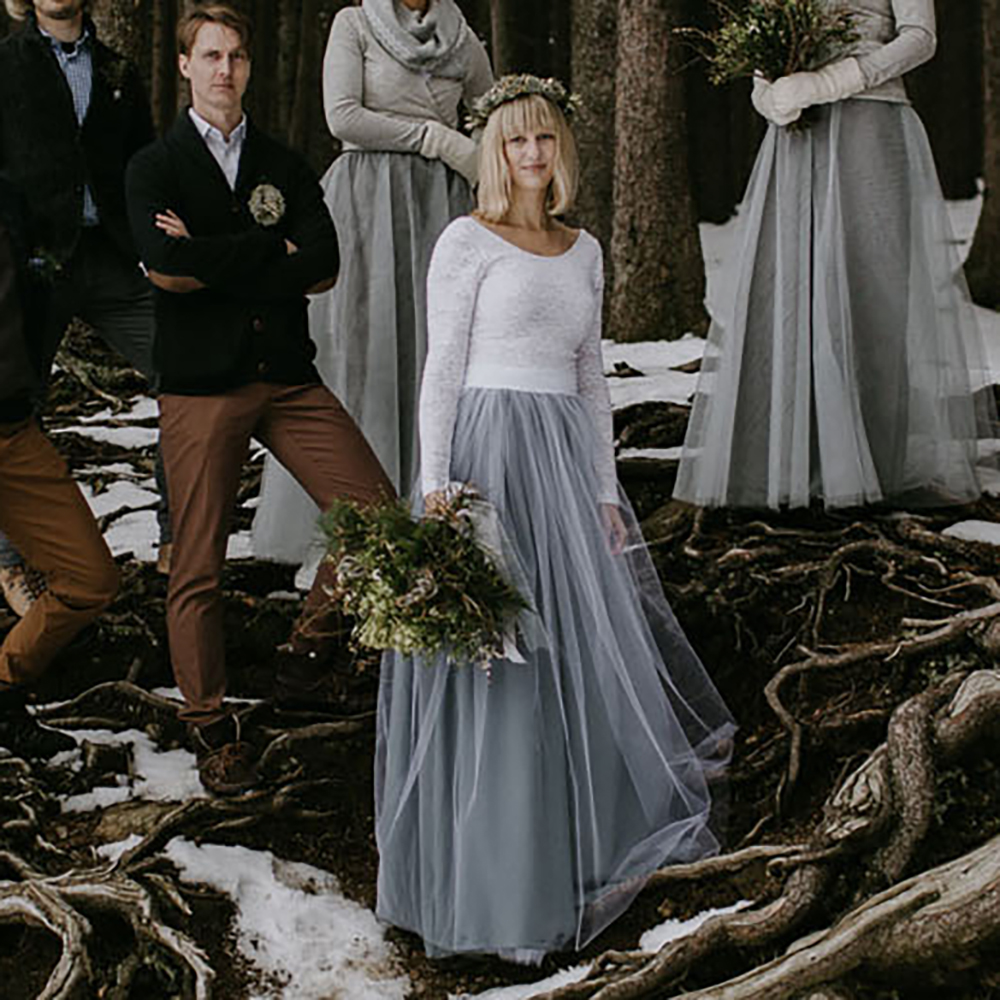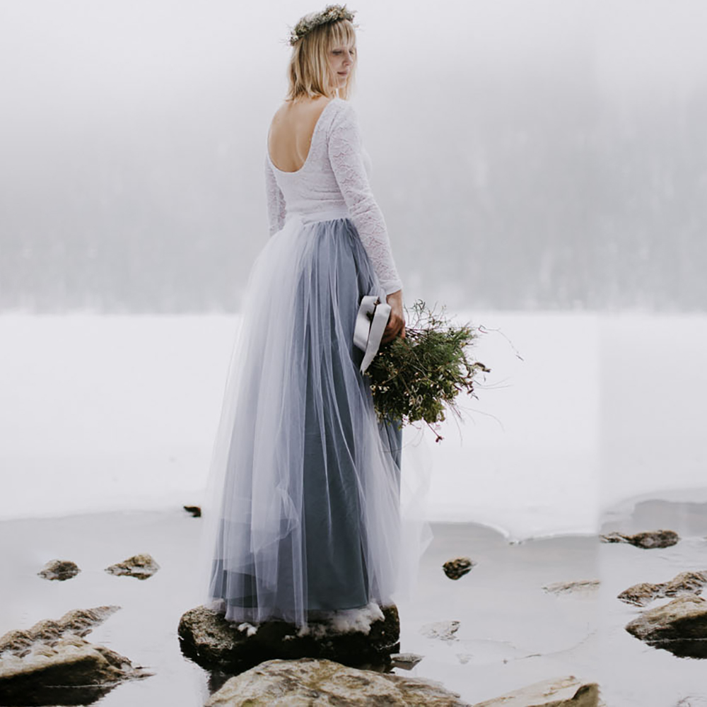Scoop Lace Long Sleeves Maxi Winter Wedding Dress Chic Two Tone Tulle A Line Floor Length Backless Lace Teal Blue Bridal Gowns