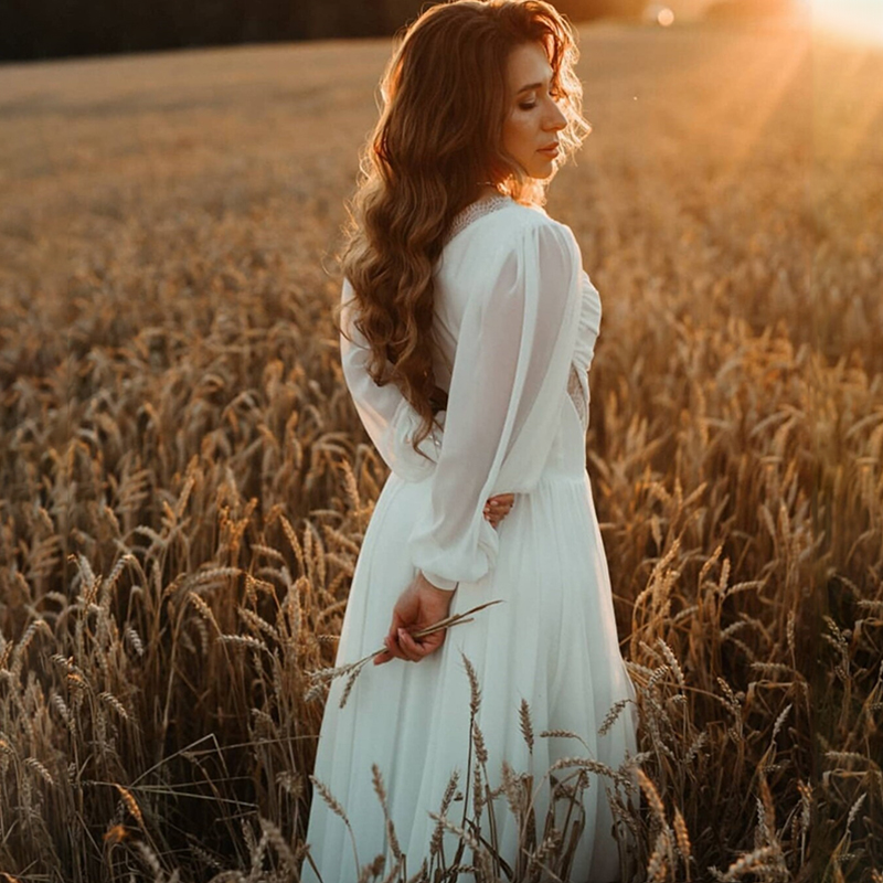 Sexy Chiffon A-Line Wedding Dress Elegant Puff Button Sleeve V-Neck Bridal Gown