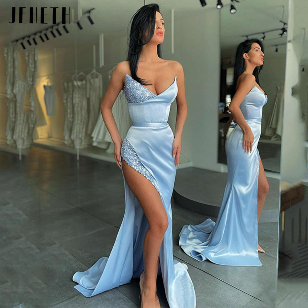 Sky Blue Sexy Sequined Satin Side Split Mermaid Evening Dresses Exquisite Strapless Deep V-Neck Prom Gown