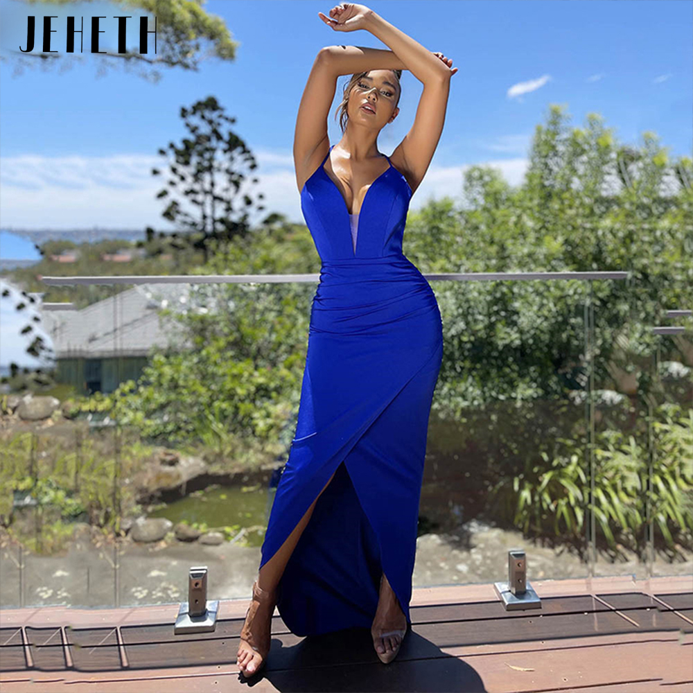 Royal Blue Sexy Mermaid V-Neck Satin Evening Dresses spaghetti straps Slit Prom Party Gown
