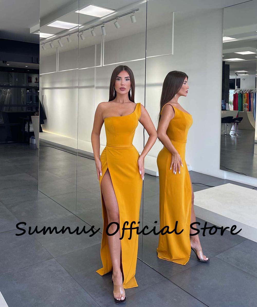 Gold One Shoulder Evening Dresses Spandex Satin Leg Split Floor Length Event Gowns