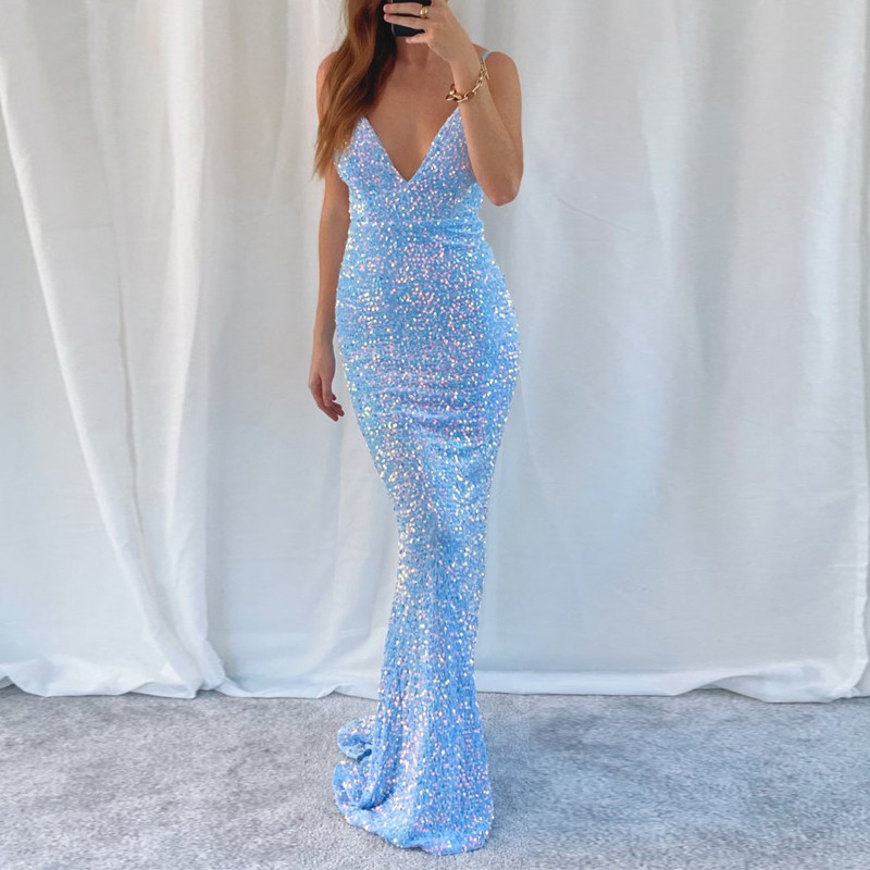Sky Blue Sequin Mermaid Prom Dresses V Neck Sexy Backless Formal Evening Party Gown